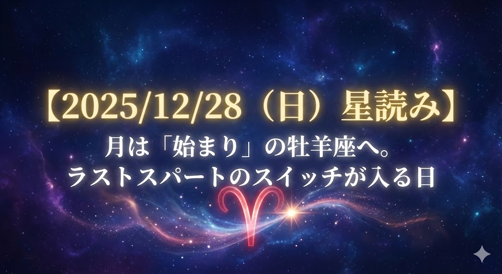 牡羊座のエネルギーは強力ですが、時に「焦り」や「イライラ」として出ることもあります。 特に年末は「あれも終わっていない!」と慌てがちですが、今日の星は**「動き出せば、終わる」**と教えてくれています。 頭で考えて不安になる前に、まずは手を動かすこと。それが不安を消す一番の特効薬です。