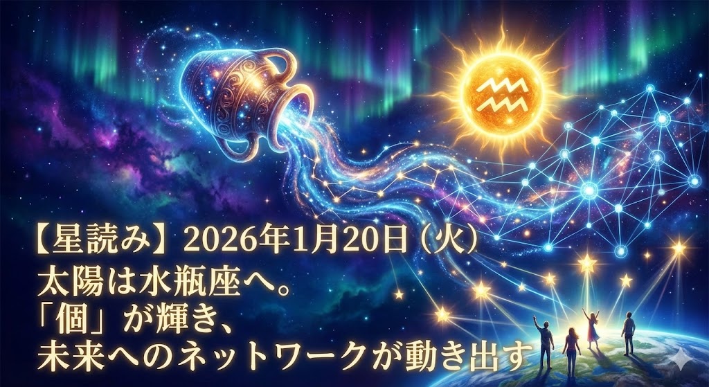本日、太陽が水瓶座に入ります。 水瓶座は「博愛」「平等」「改革」「独創性」を象徴するサイン。 常識や既存のルールに縛られるのではなく、「自分はどうしたいのか」「より良い未来のために何ができるか」を問い直す時期が始まります。これまでの「縦社会」の意識から、フラットな「横の繋がり」へと意識がシフトしていく初日です。